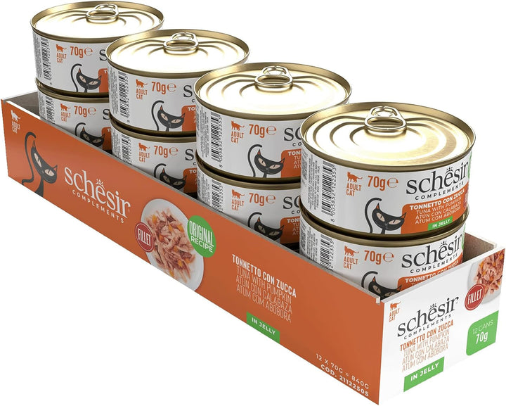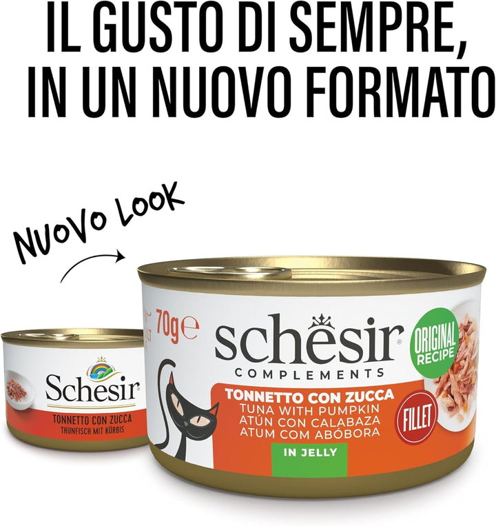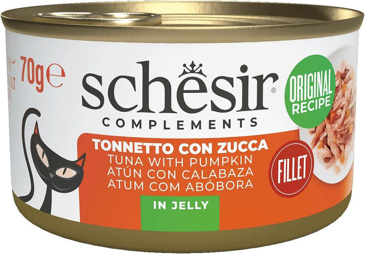 - Schesir tunfileter med græskar i gelé: ægte tunfileter med græskarspidser, indpakket i gelé, mad til katte, der foretrækker en mere kompakt konsistens